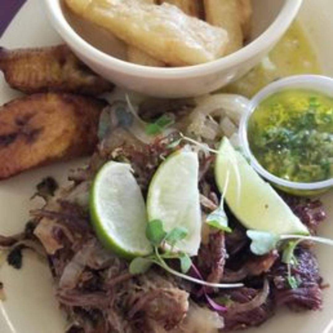 Crispy, pan-fried shredded beef marinated in citrus and garlic. Served with moro rice and sweet plantains.