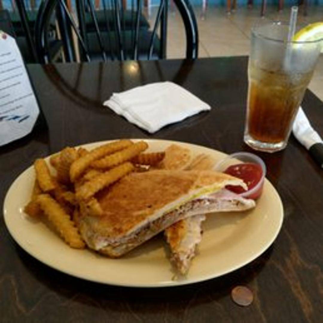 A classic Cuban sandwich featuring roasted pork, ham, Swiss cheese, pickles, and mustard, pressed to perfection on Cuban bread.