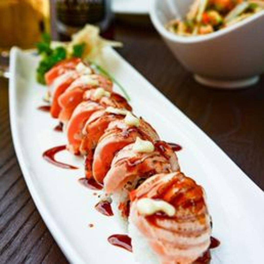Fresh salmon, avocado, and spicy mayonnaise rolled in sushi rice and nori seaweed. Cut into bite-sized pieces and served with soy sauce, wasabi, and ginger.