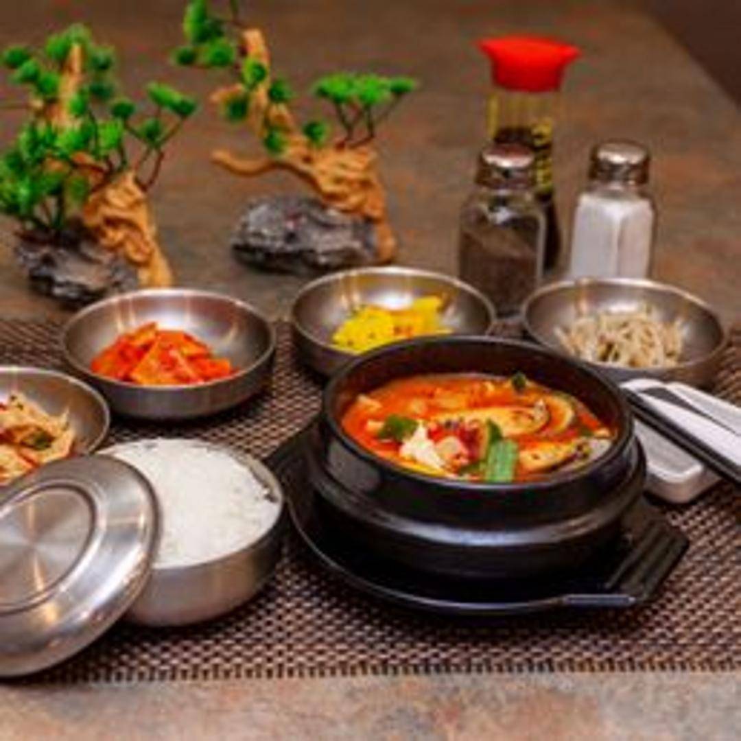 Large bowl of soft tofu stew with vegetables, often containing seafood or meat in a spicy broth. Served hot.