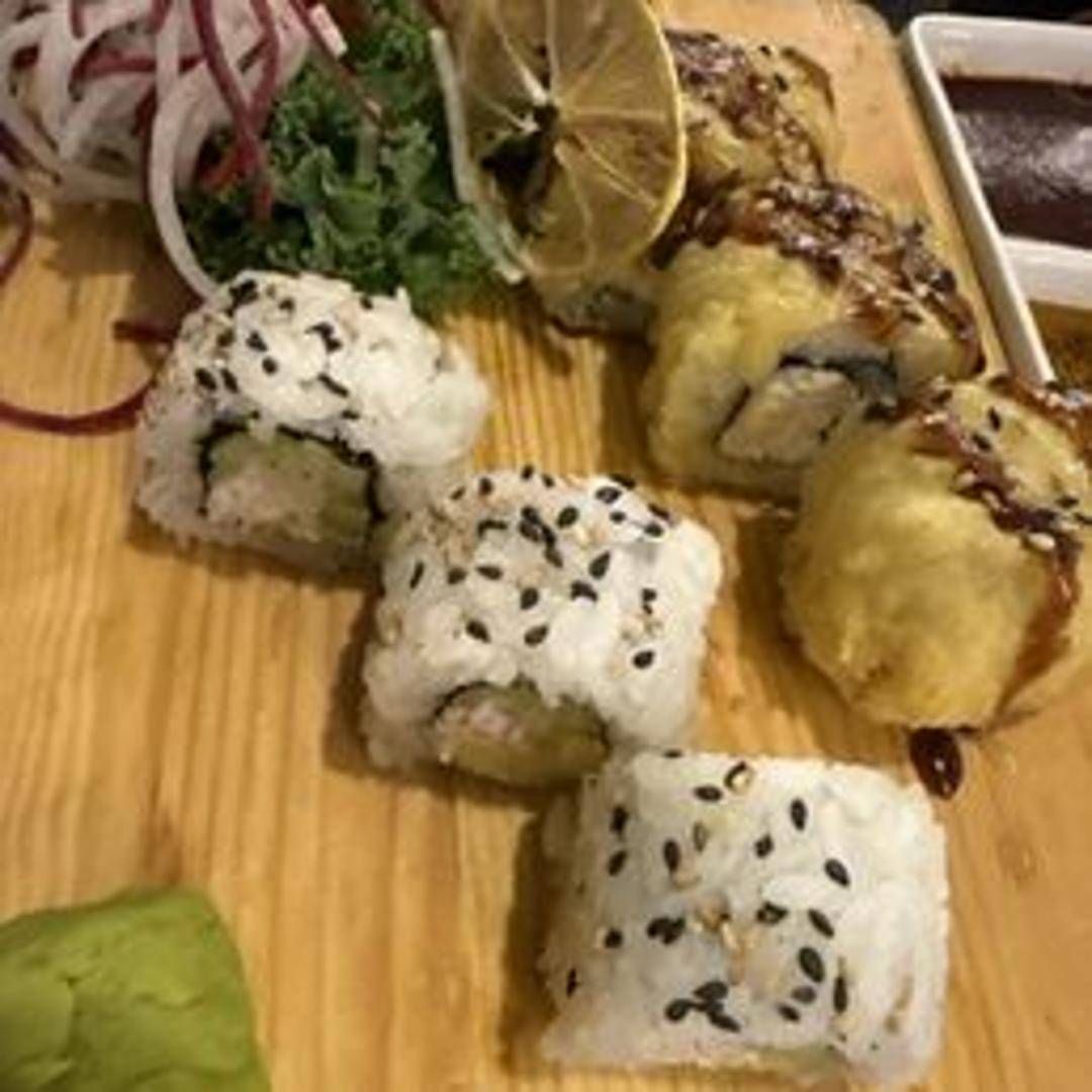 A combination of 5 pieces of nigiri sushi (thinly sliced raw fish over rice) and California rolls.