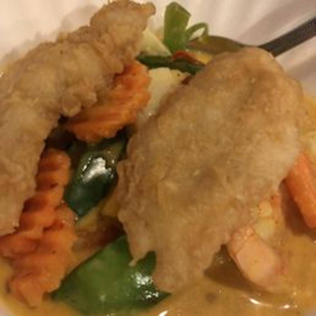 A distinctive and delightful Thai curry that beautifully marries sweet and savory notes. This unique curry features a rich, aromatic curry base (often yellow or red) simmered with creamy coconut milk and generous chunks of ripe, fresh mango, along with your choice of protein and various vegetables. It offers a tropical and harmonious twist on traditional Thai flavors.
