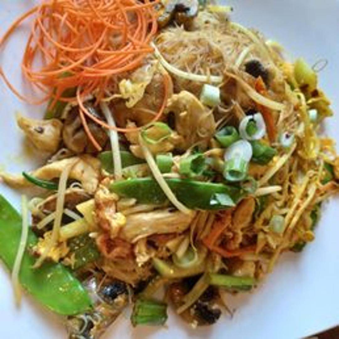 A popular and flavorful stir-fried noodle dish, featuring thin vermicelli noodles tossed with a vibrant yellow curry powder. This aromatic dish typically includes tender slices of char siu pork, succulent shrimp, and a colorful assortment of crisp vegetables like bell peppers, onions, and bean sprouts, creating a savory and satisfying experience.