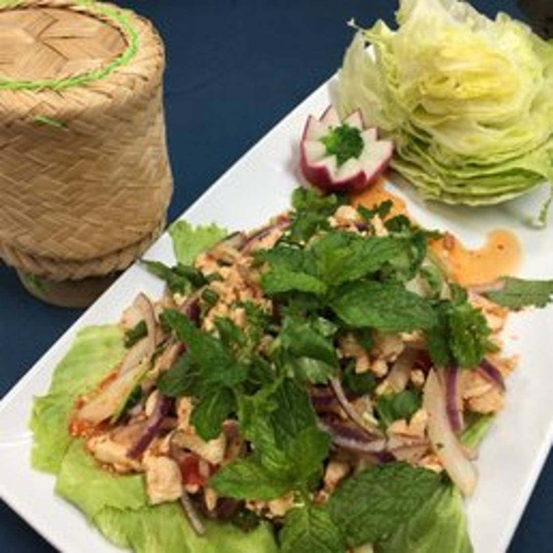 Experience the vibrant flavors of Thai cuisine with our zesty Chicken Salad, a refreshing dish inspired by Larb Gai. Minced chicken is tossed with toasted ground rice, fresh herbs including mint, cilantro, and spring onion, then dressed in a tangy lime-based dressing with fish sauce and a hint of chili, creating a fragrant and spicy delight.