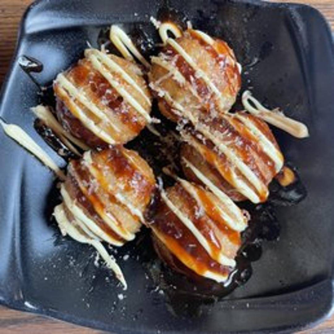 Fried octopus balls topped with takoyaki sauce, mayonnaise, dried seaweed flakes, and bonito flakes. A popular Japanese street food.