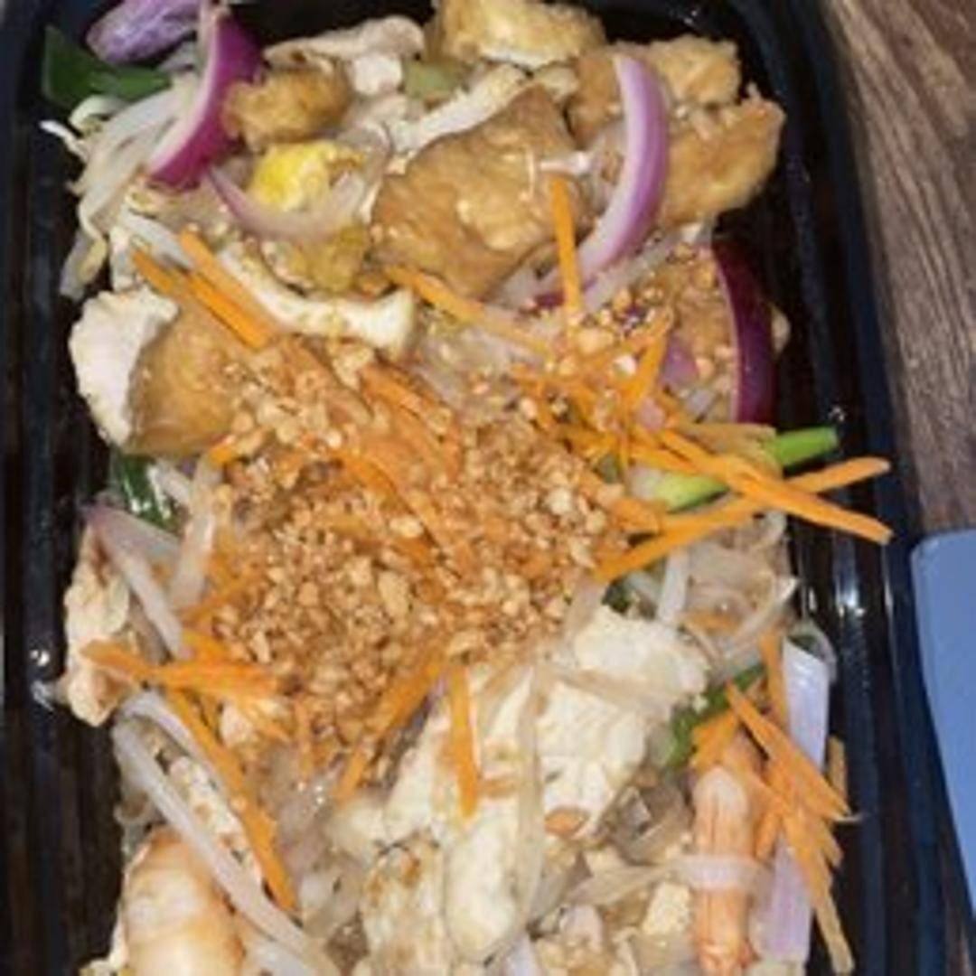 Thin rice noodles stir-fried with shrimp, tofu, bean sprouts, egg, and peanuts in a tangy tamarind sauce. Garnished with lime wedge and ground peanuts.