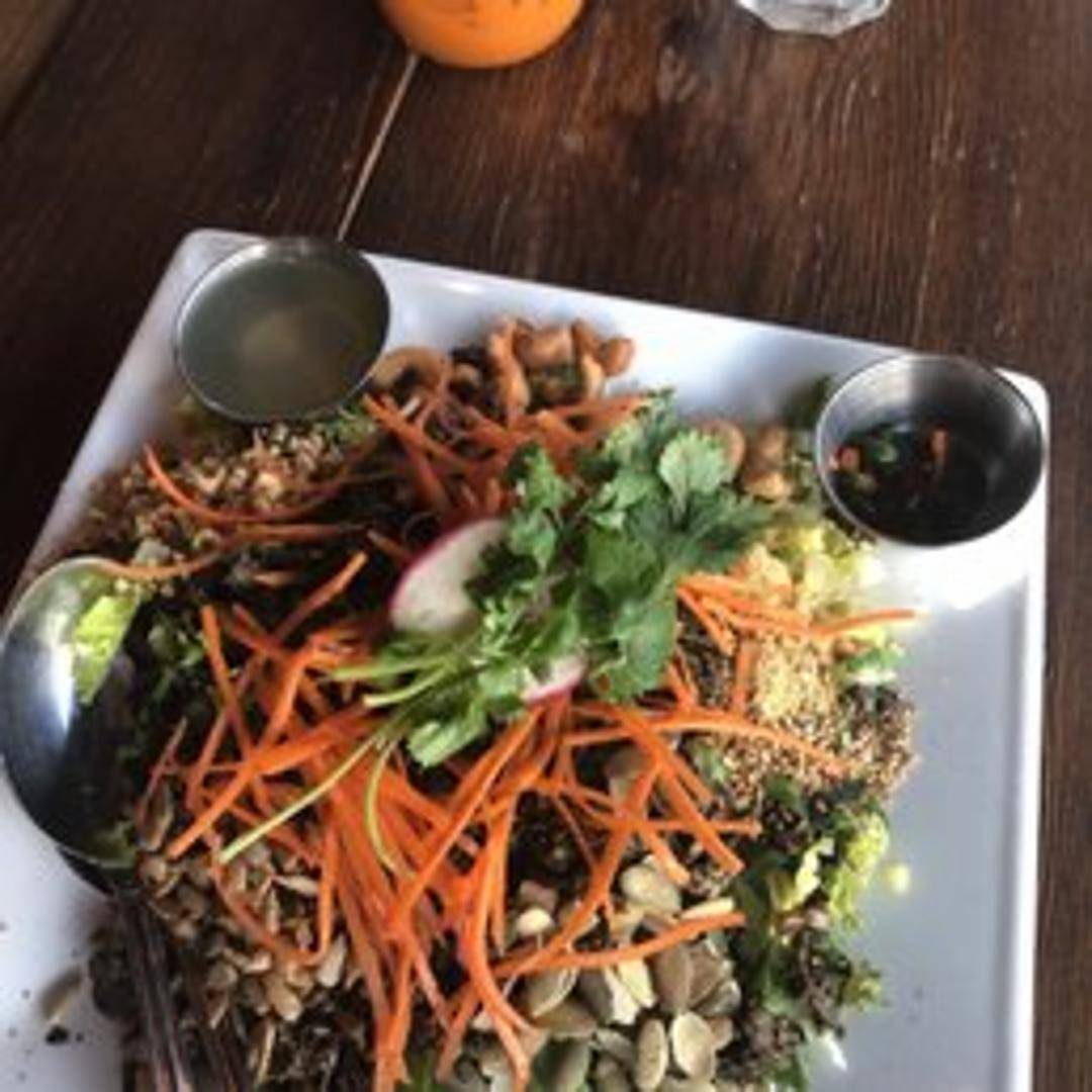 A vibrant and flavorful salad featuring fermented tea leaves, crunchy nuts, fried garlic, sesame seeds, tomatoes, lettuce, and a tangy dressing. A textural and aromatic experience unique to Burmese cuisine.