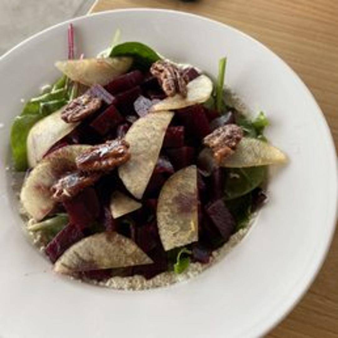 A vibrant and earthy salad featuring tender roasted beets, mixed greens, crumbled goat cheese, and toasted walnuts, all tossed in a light and zesty lemon-herb vinaigrette. A refreshing and nutritious option bursting with flavor and color.