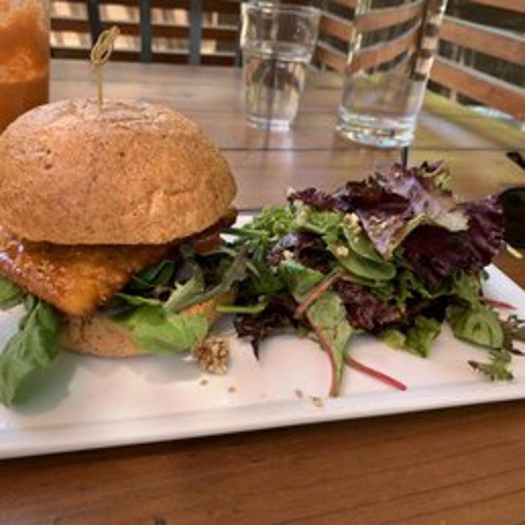 A hearty and flavorful plant-based burger featuring marinated tempeh, grilled to perfection. Served on a toasted bun with fresh lettuce, tomato, onion, and your choice of sauce. A satisfying and delicious alternative to traditional burgers.