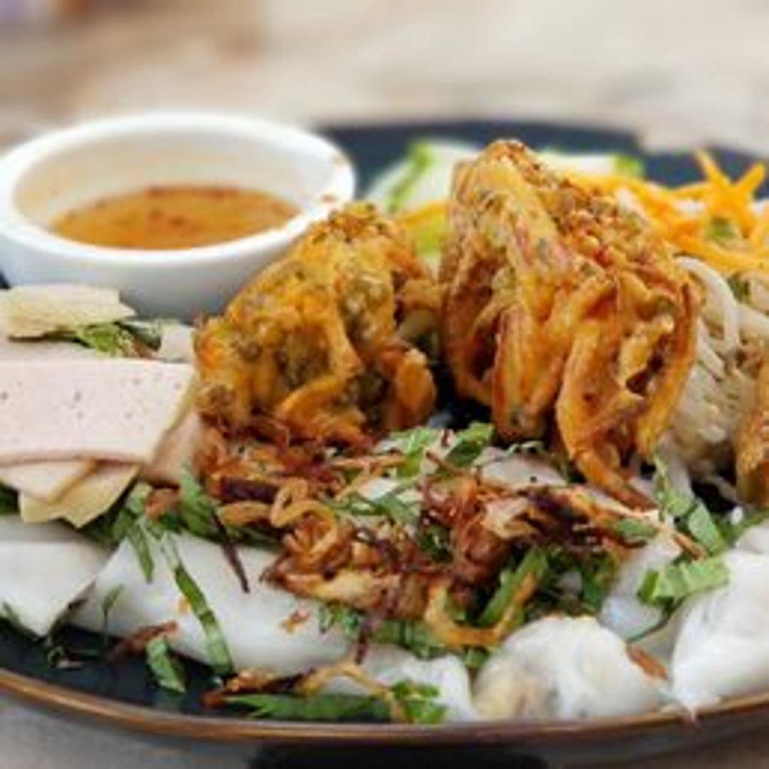 Delicate and translucent steamed rice noodle rolls, thinly made and elegantly folded, typically filled with seasoned ground pork and wood ear mushrooms. These soft, silky rolls are traditionally served with crispy fried shallots, fresh herbs, Vietnamese pork sausage (chả lụa), and a light, savory nuoc cham dipping sauce, offering a comforting and authentic experience.