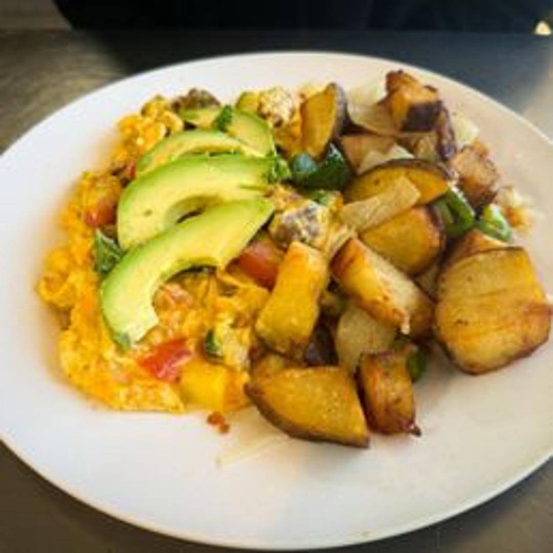 A hearty scramble featuring a colorful medley of fresh seasonal vegetables, including bell peppers, onions, mushrooms, tomatoes, and spinach, all cooked with fluffy scrambled eggs. Served with your choice of toast and a side of fresh fruit.