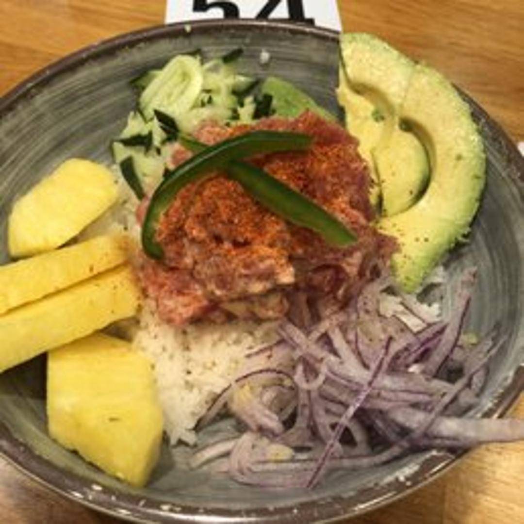 A Hawaiian-inspired bowl with fresh, sushi-grade tuna marinated in a savory soy sauce blend. Served over a bed of white rice and includes seaweed salad, avocado, edamame, green onions, and sesame seeds. A drizzle of spicy mayo adds a touch of heat.