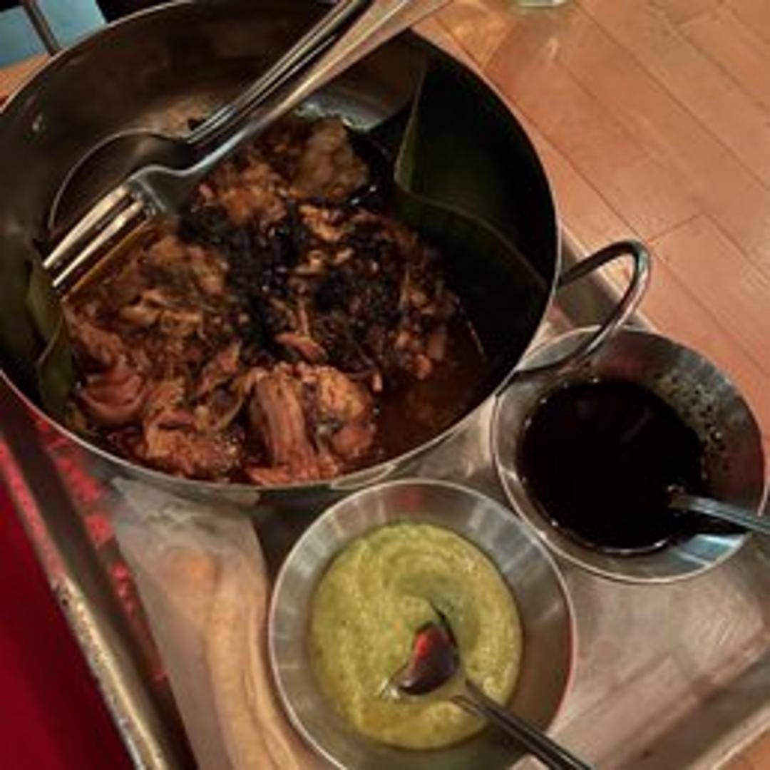 Slow-cooked black pork, rich in flavor, often served with traditional Latin American sides.