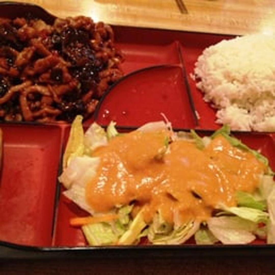 A convenient and well-rounded meal served in a compartmentalized box, typically featuring a main entrée such as a stir-fry or meat dish, accompanied by rice and a selection of complementing sides like spring rolls, vegetables, or an egg roll, offering a complete and satisfying dining experience.