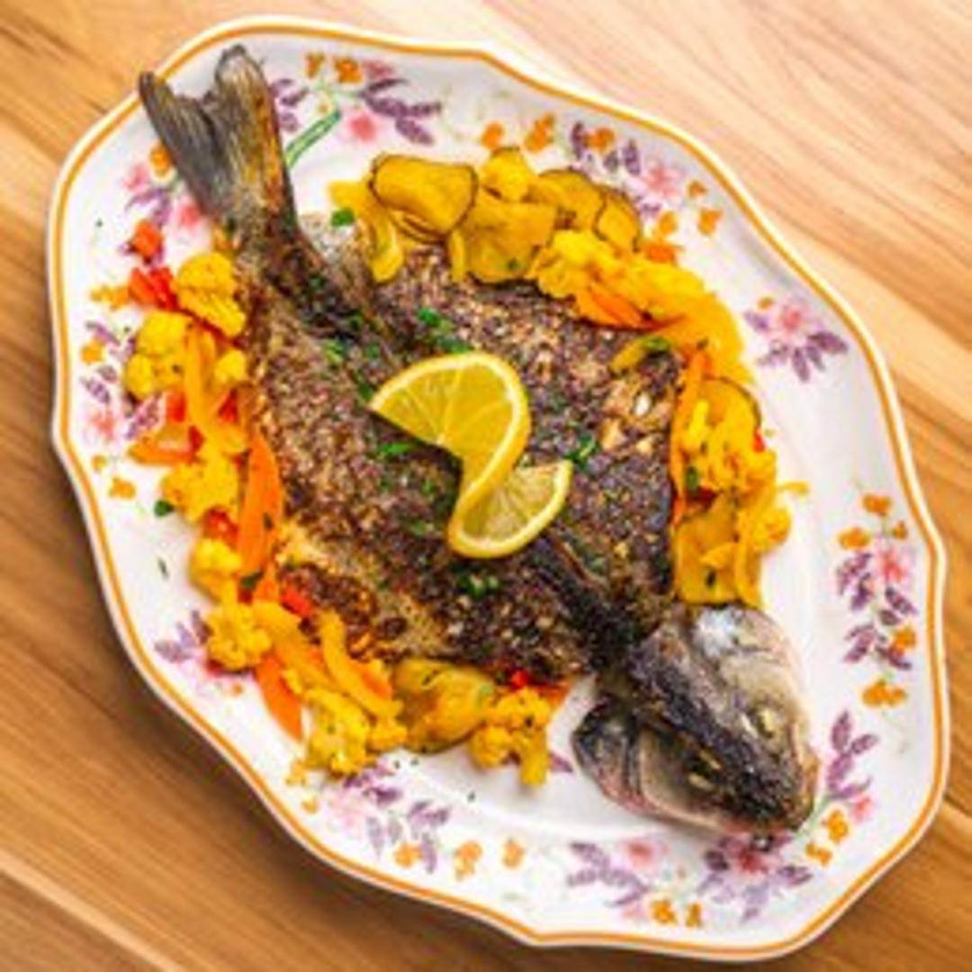 A whole Mediterranean Branzino, skillfully spatchcocked and roasted or grilled to perfection, resulting in delicate, flaky white meat with crisp, flavorful skin, often simply prepared to highlight its fresh, oceanic essence.
