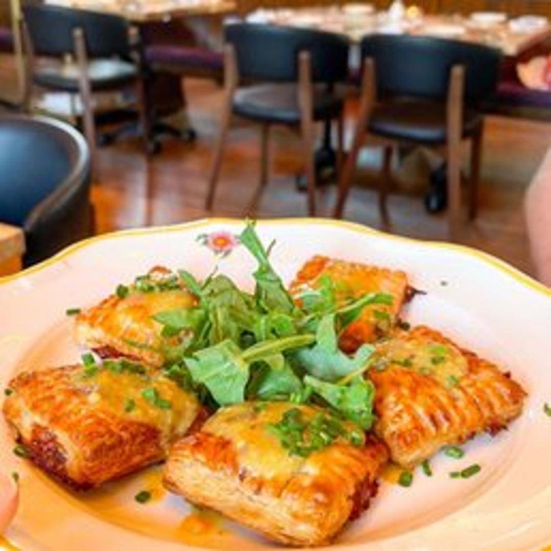 A luxurious appetizer featuring a wheel of creamy, rich brie cheese, expertly baked until perfectly warm and melty. Encased in a delicate, golden-brown puff pastry, it's often accompanied by seasonal fruit compote, toasted nuts, or a drizzle of local honey, offering a delightful interplay of textures and flavors.