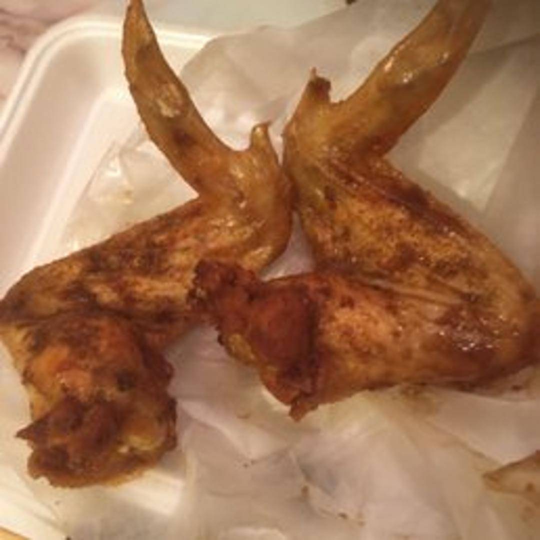 Three pieces of chicken wings, cooked and prepared at Supreme BBQ.