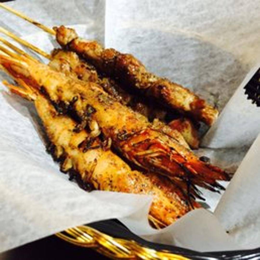 Three skewers loaded with succulent pieces of marinated chicken, grilled to a smoky perfection. Each bite delivers juicy tenderness and a burst of savory flavors.