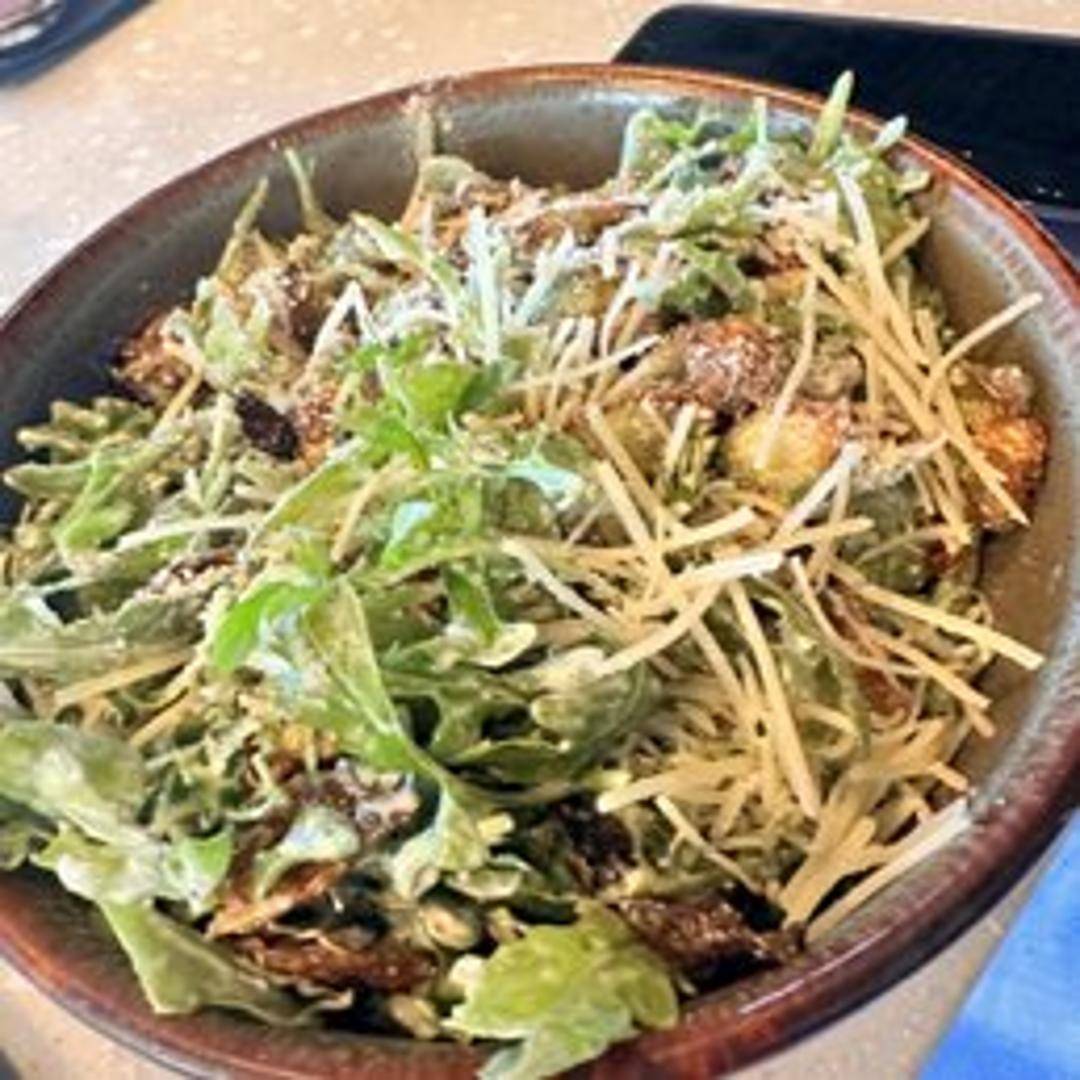 Roasted Brussel sprouts tossed in a creamy Caesar dressing with parmesan cheese, croutons, and crispy bacon bits.