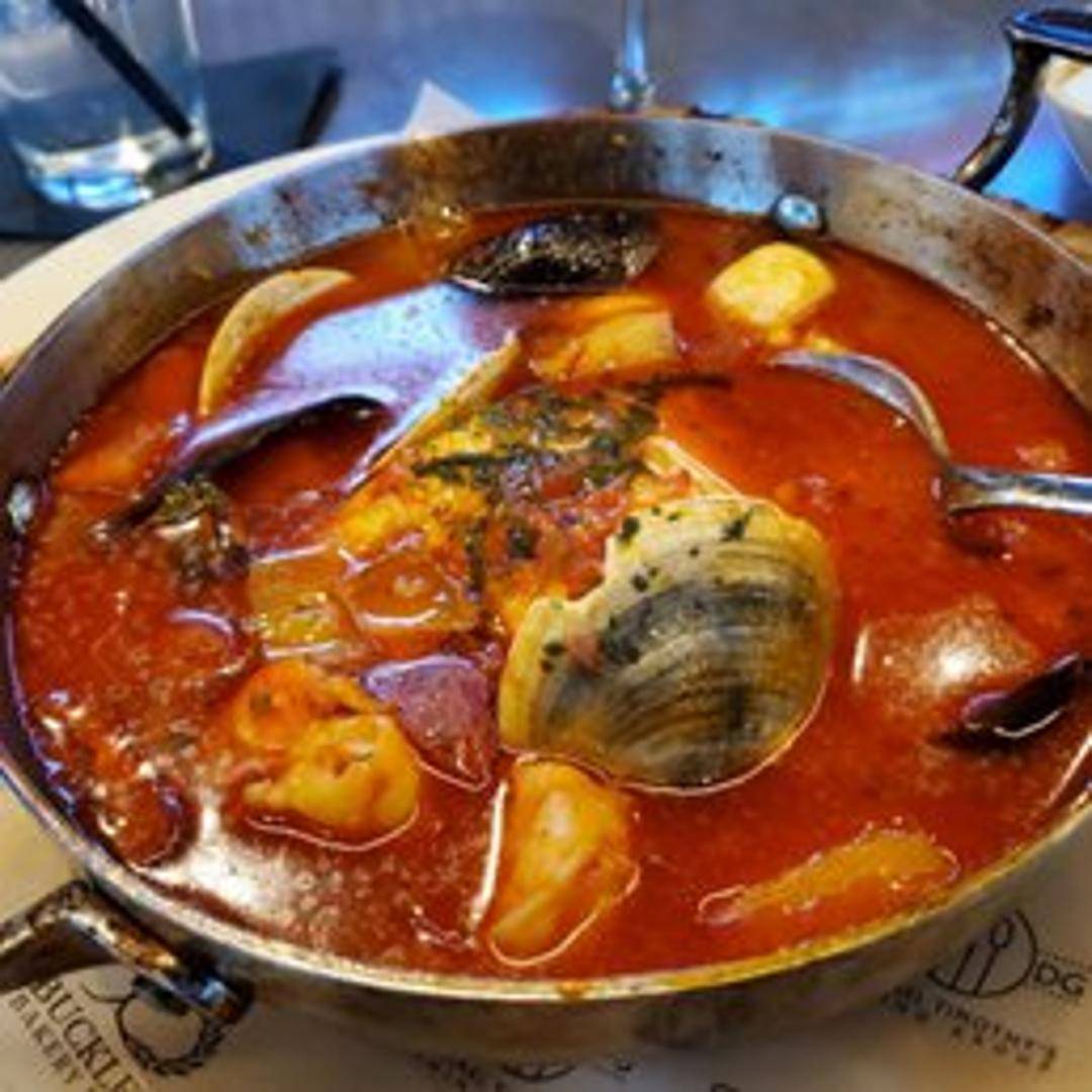 A hearty and aromatic stew brimming with fresh seafood such as clams, mussels, shrimp, and cod, simmered in a tomato-based broth infused with chorizo, peppers, and herbs. Served with crusty bread for dipping.