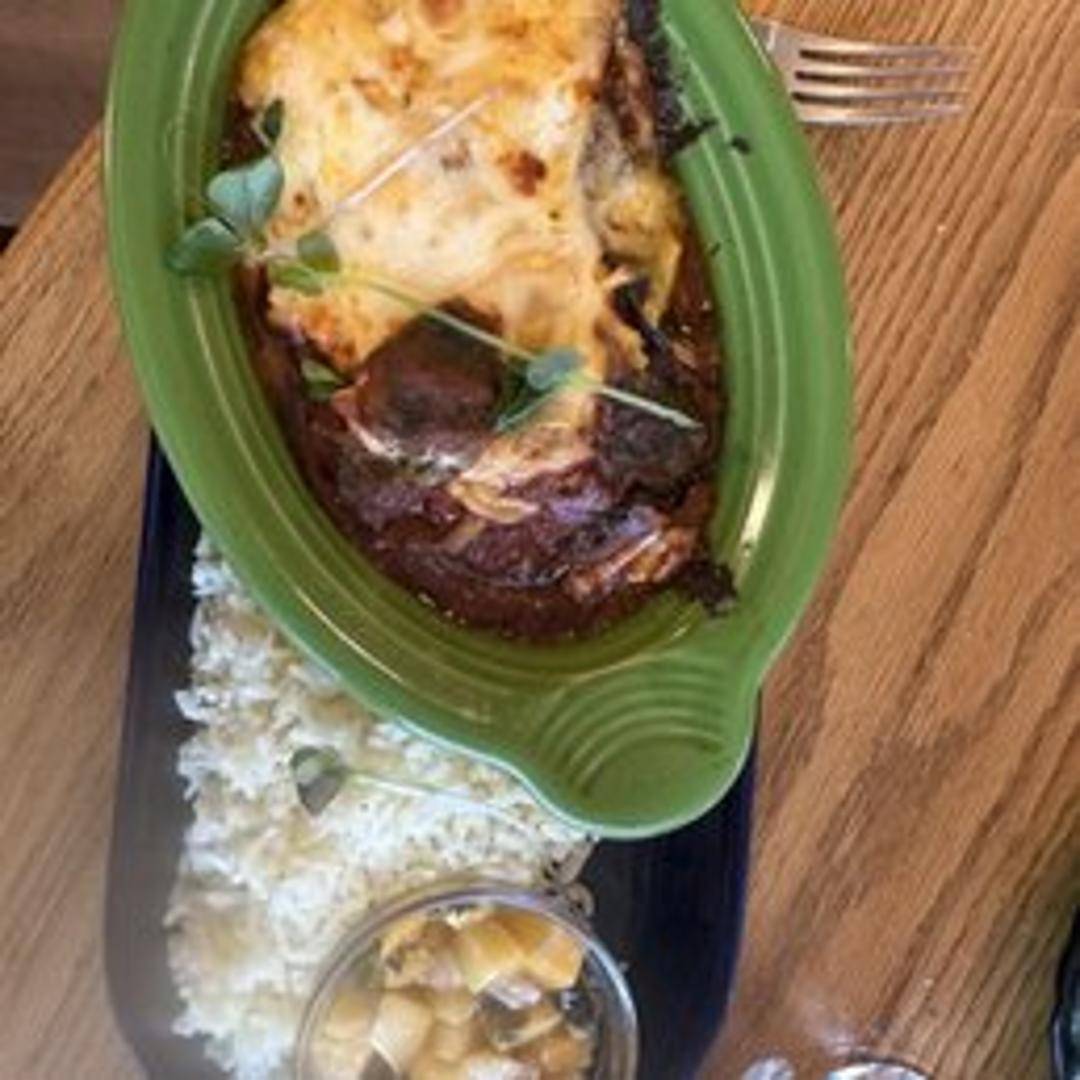 Authentic blue corn tortillas filled with tender, slow-cooked chicken and smothered in a flavorful Chimayo red chile sauce. Topped with melted cheese and served with a side of your choice.