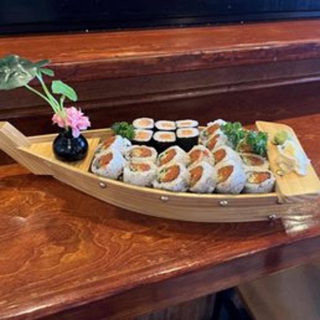 A simple and classic sushi roll made with fresh salmon, sushi rice, and seaweed (nori).