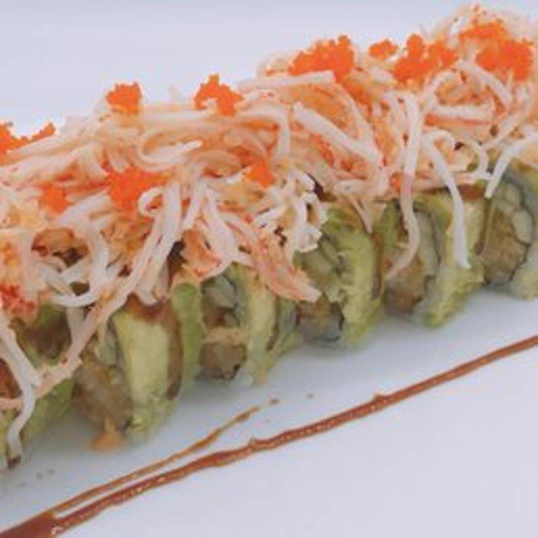 A signature roll with shrimp tempura, avocado, and cream cheese. Topped with seared beef and a special sauce.