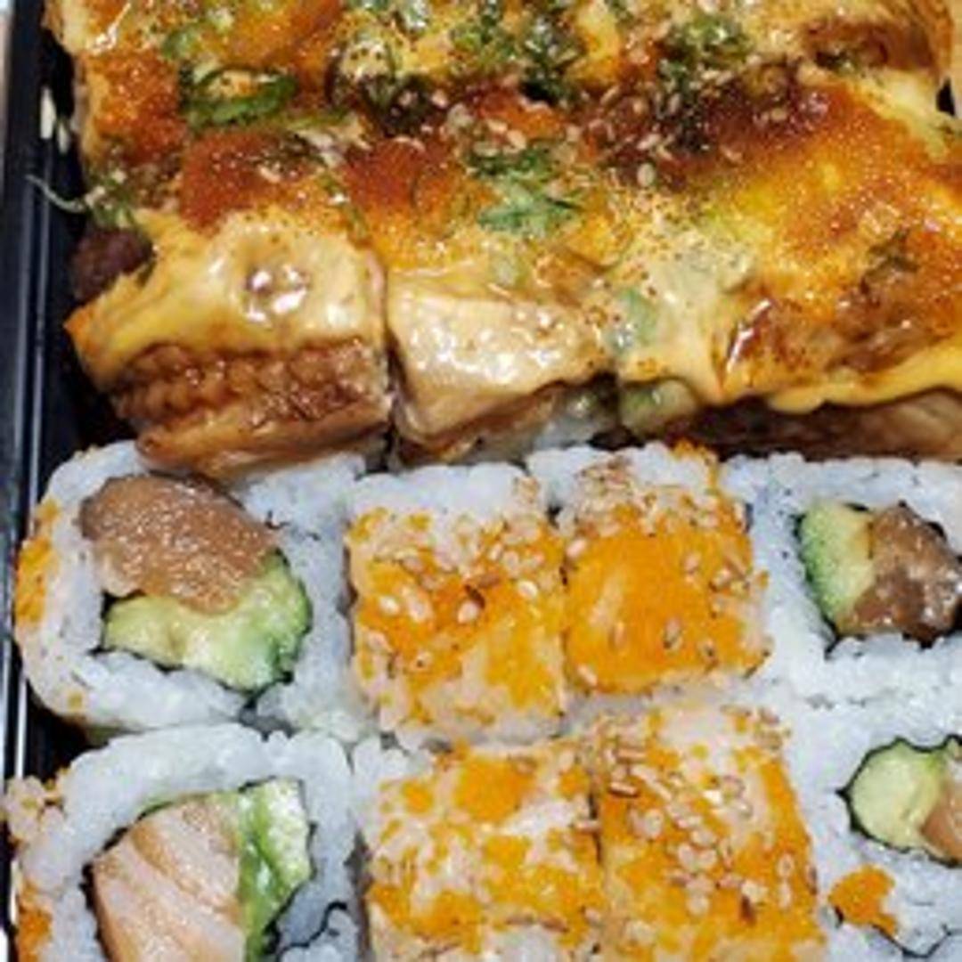 Black rice roll filled with shrimp tempura, avocado, and cucumber. Topped with spicy mayo, eel sauce, and black tobiko.
