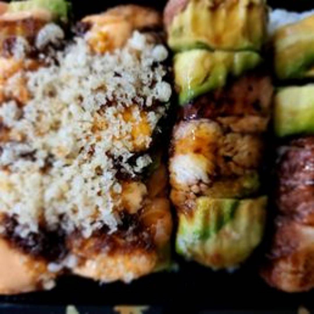 A sushi roll typically featuring shrimp tempura and avocado, topped with eel (unagi) and eel sauce, creating a visually striking black and brown appearance.