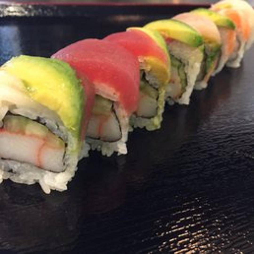 A visually stunning sushi roll consisting of a California roll base topped with an assortment of thinly sliced fish, such as tuna, salmon, and avocado, creating a colorful presentation.