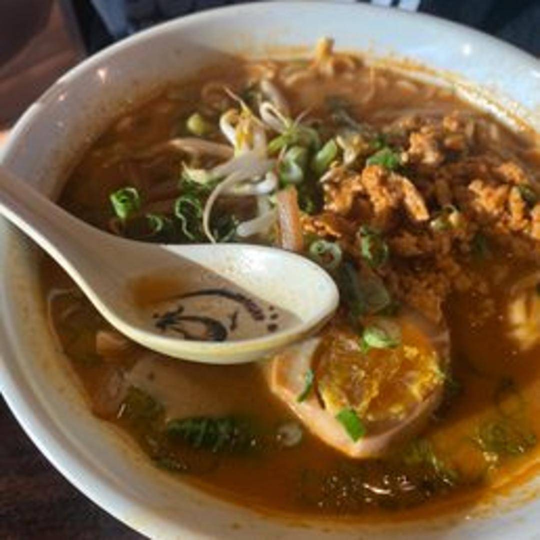 Chicken broth with spicy seasoning, topped with chicken, soft boiled egg, bamboo shoots, scallions, and seaweed.