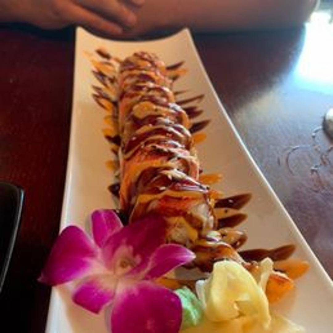 Tuna, avocado, and cucumber roll wrapped in a beautiful layer of tuna. Topped with spicy mayo and a sprinkle of sesame seeds.
