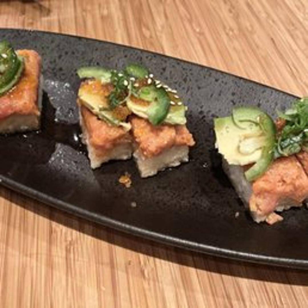Tuna, spicy mayo, cucumber, and avocado rolled in sushi rice and nori seaweed. Often topped with sesame seeds.