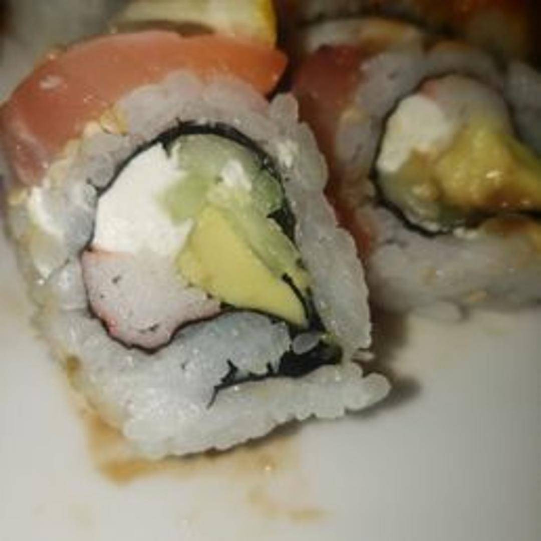 A vibrant and beautifully crafted sushi roll, inspired by the warm colors of a sunset. It typically combines fresh, thinly sliced fish such as salmon or tuna, draped over a roll filled with delectable ingredients like avocado and cucumber, often finished with a sweet or tangy sauce.