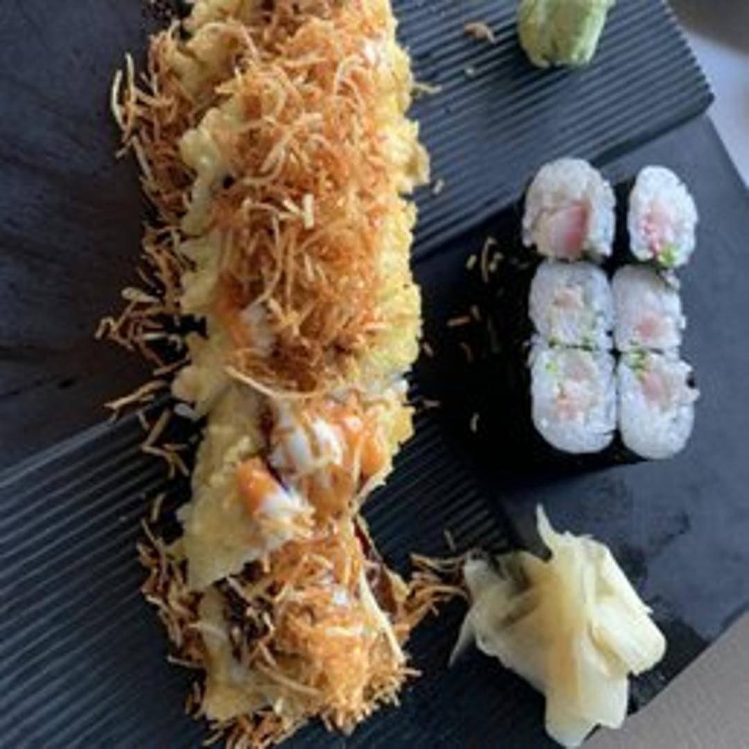 A hearty and generously sized sushi roll, featuring a robust combination of fresh seafood like shrimp tempura and crab stick, crisp vegetables, and often finished with a dynamic sauce or crunchy toppings. It's designed for a substantial and satisfying sushi experience.
