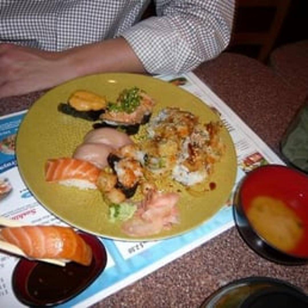 Two pieces of fresh, thinly sliced yellowtail (hamachi) served over small beds of seasoned sushi rice.