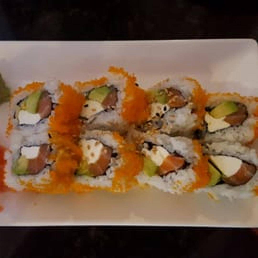 Cream cheese, smoked salmon, and cucumber rolled in sushi rice and nori seaweed, often topped with sesame seeds.