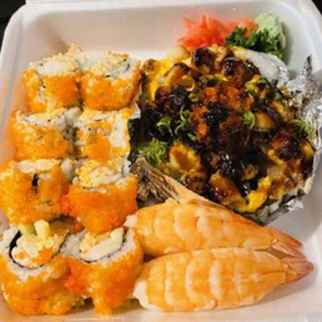 A sushi roll with spicy tuna, shrimp tempura, avocado, and cucumber. Usually rolled in nori seaweed and sushi rice, and often topped with a spicy mayo or sriracha sauce.