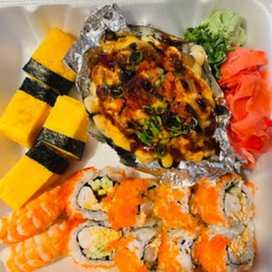 A sushi roll topped with a creamy mixture of baked scallops, mayonnaise, and other seasonings. Often includes crab meat or other seafood. Usually rolled with nori seaweed and sushi rice.