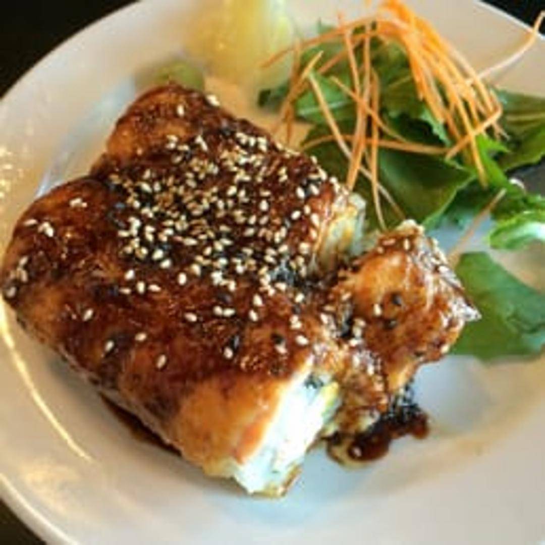 A spicy sushi roll featuring [Assume: Tuna or Salmon] with avocado, cucumber, and a fiery blend of spices and hot sauce. (Specific fish and ingredients not listed.)