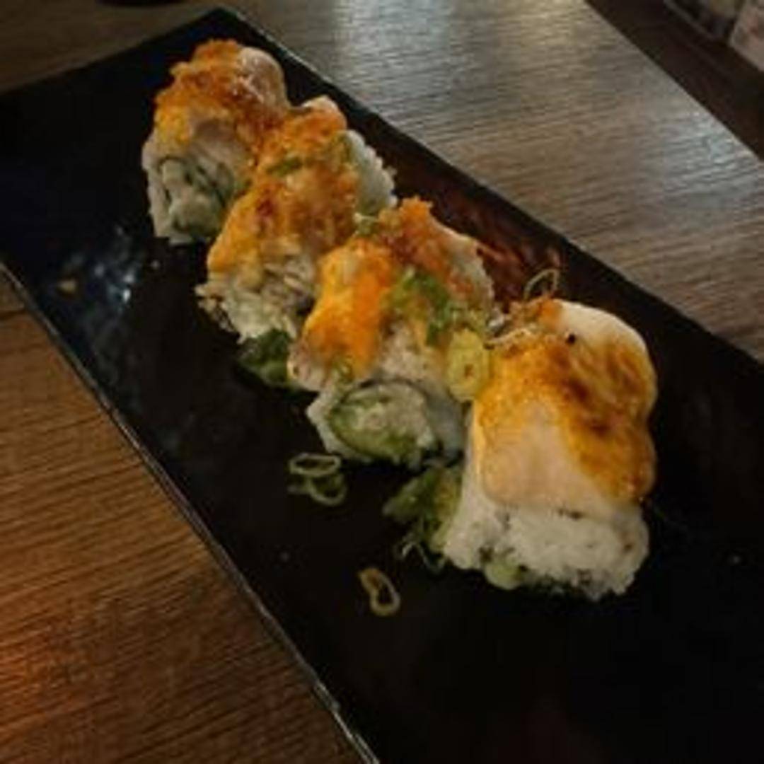 A California roll topped with baked seafood, spicy mayo, and eel sauce. Garnished with masago and green onions.