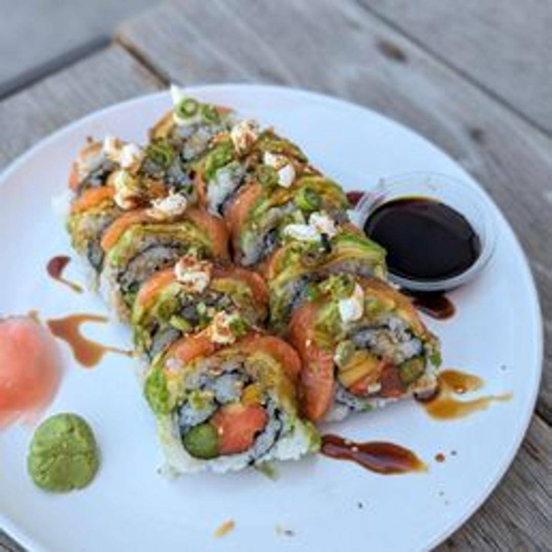 A vibrant and flavorful sushi roll filled with tempura shrimp, cream cheese, avocado, and mango, topped with a sweet chili sauce and toasted coconut flakes.