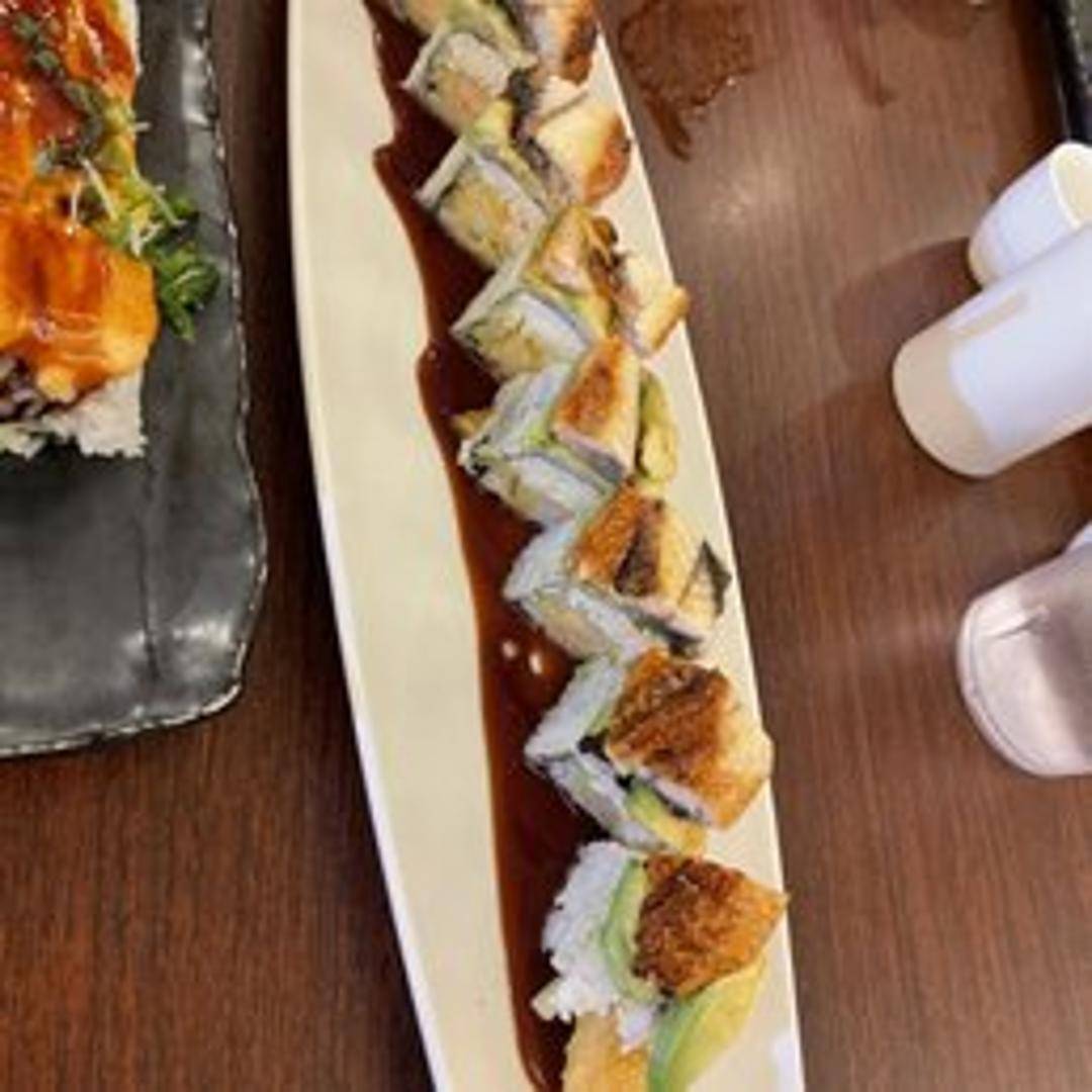 A visually stunning sushi roll featuring crab meat, cucumber, and avocado inside, wrapped in sliced avocado and topped with eel sauce and sesame seeds.