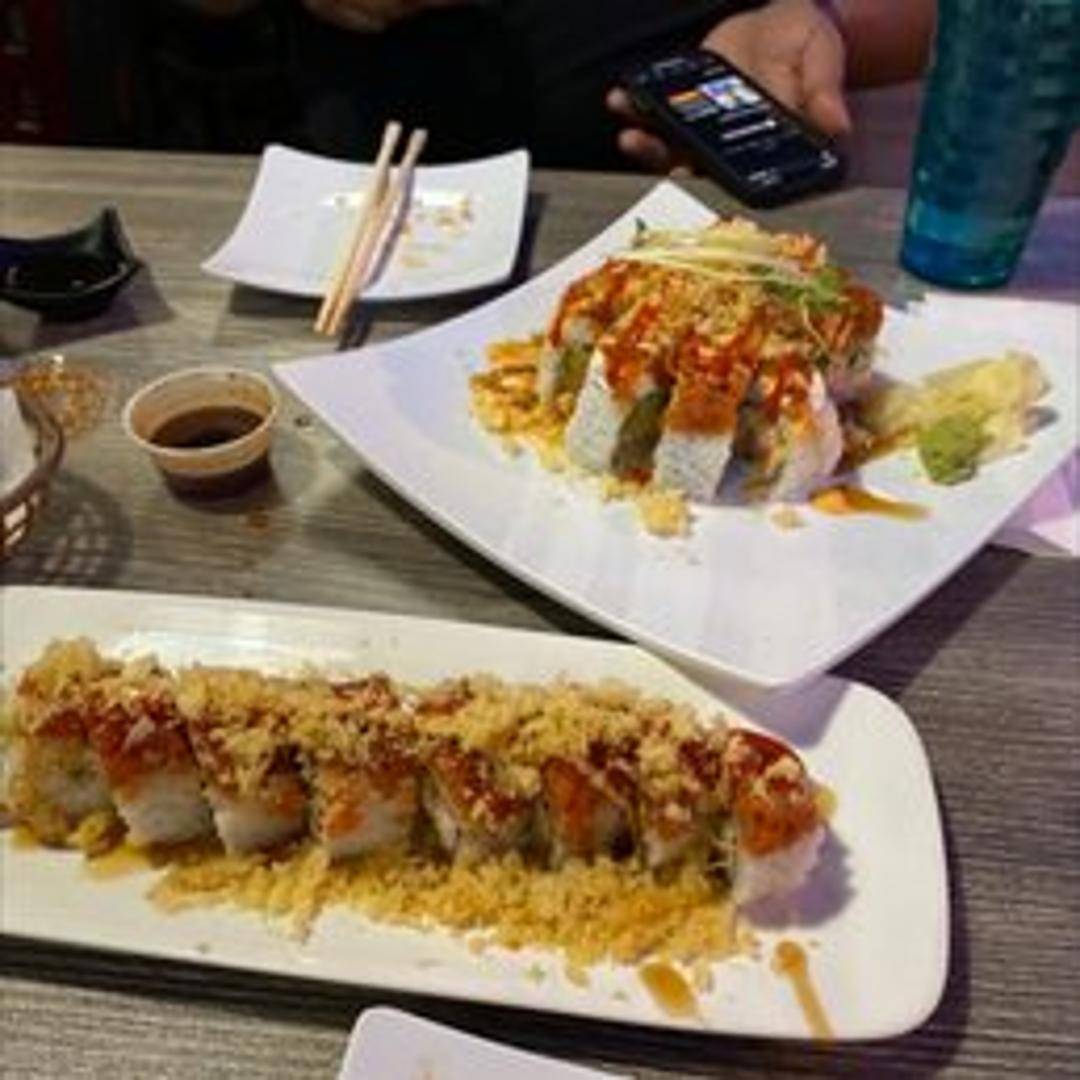 A California roll topped with assorted fish, baked in a spicy sauce, and finished with green onions and masago.