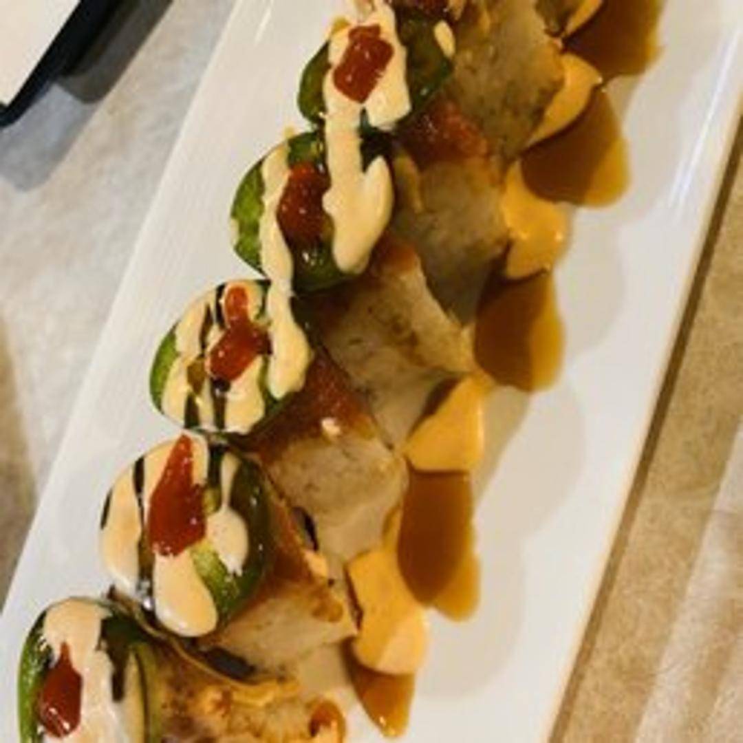 A spicy sushi roll featuring a combination of fresh ingredients, typically including tuna or other seafood, avocado, cucumber, and a fiery blend of chili sauce and spices. Often topped with a contrasting sauce for balance and visual appeal.