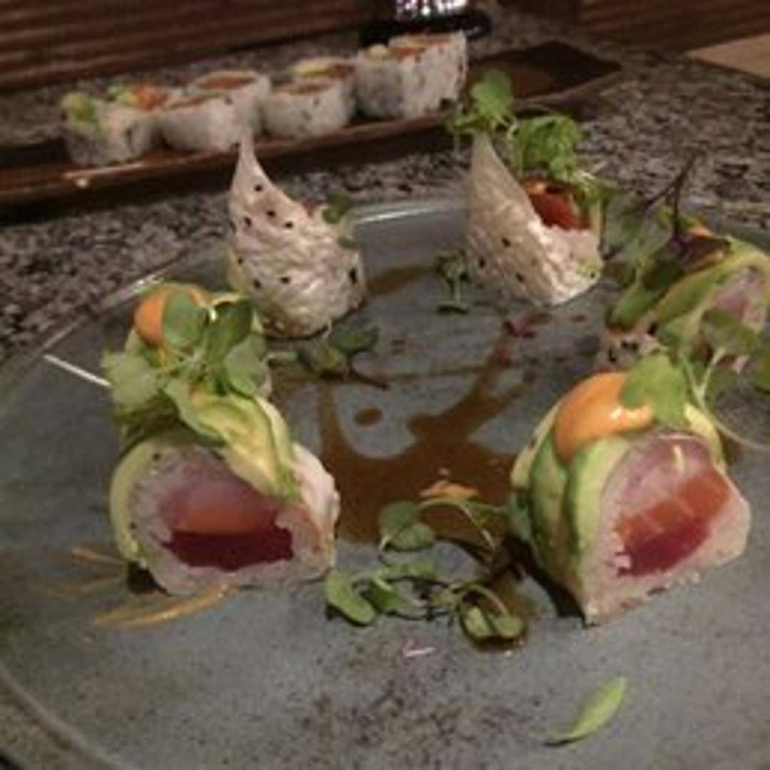 A vibrant and colorful sushi classic, the Rainbow Roll features a California roll base generously topped with an artful array of fresh fish slices, typically including tuna, salmon, and yellowtail. Its beautiful presentation and harmonious blend of flavors make it a popular choice.