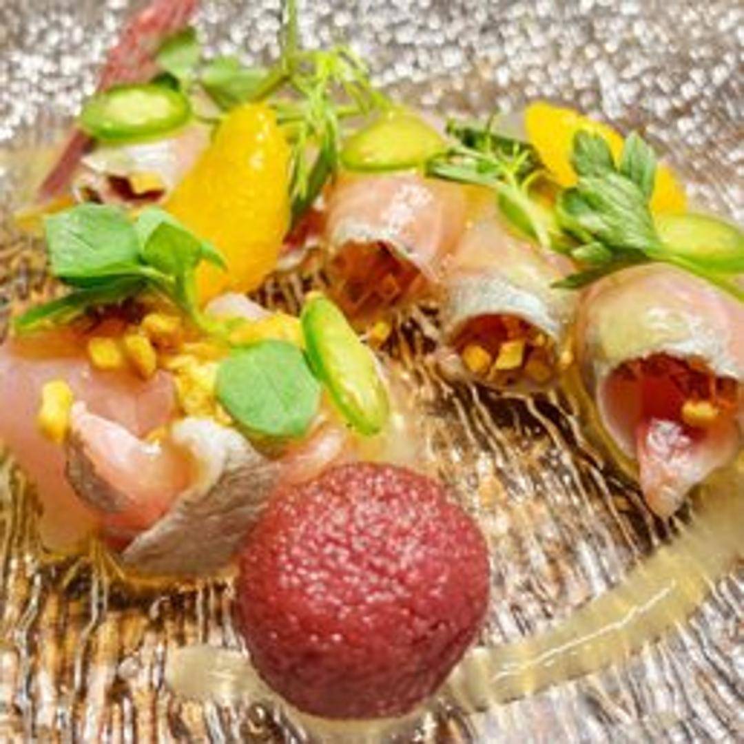 Exquisite, thinly sliced fresh yellowtail (hamachi) sashimi, elegantly arranged and delicately dressed with extra virgin olive oil, a squeeze of fresh yuzu citrus, and a hint of jalapeño for a subtle kick. Finished with a sprinkle of delicate sea salt and fresh cilantro, creating a light, refreshing, and sophisticated appetizer.
