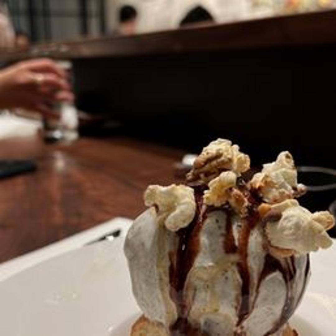 A decadent dessert featuring a thick, buttery slice of Japanese-style toast, freshly baked and toasted to golden perfection. Drizzled generously with sweet golden honey and topped with light, airy popcorn for a unique textural contrast, served alongside a scoop of premium vanilla ice cream.