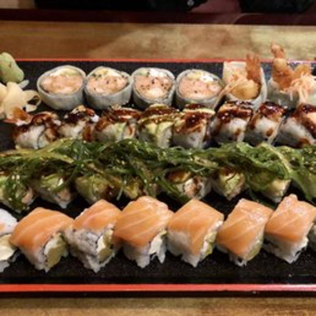 An inside-out sushi roll featuring tempura shrimp and cucumber, topped with thinly sliced avocado and a drizzle of eel sauce and sesame seeds.