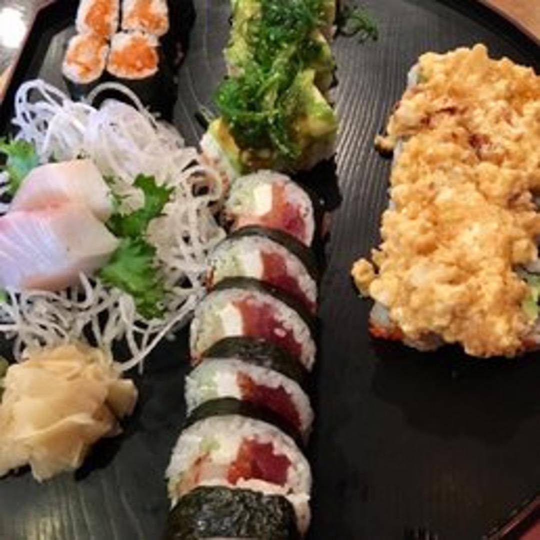 A sushi roll typically consisting of eel (unagi) and cucumber inside, topped with slices of avocado to resemble a caterpillar. Often drizzled with eel sauce and sesame seeds.